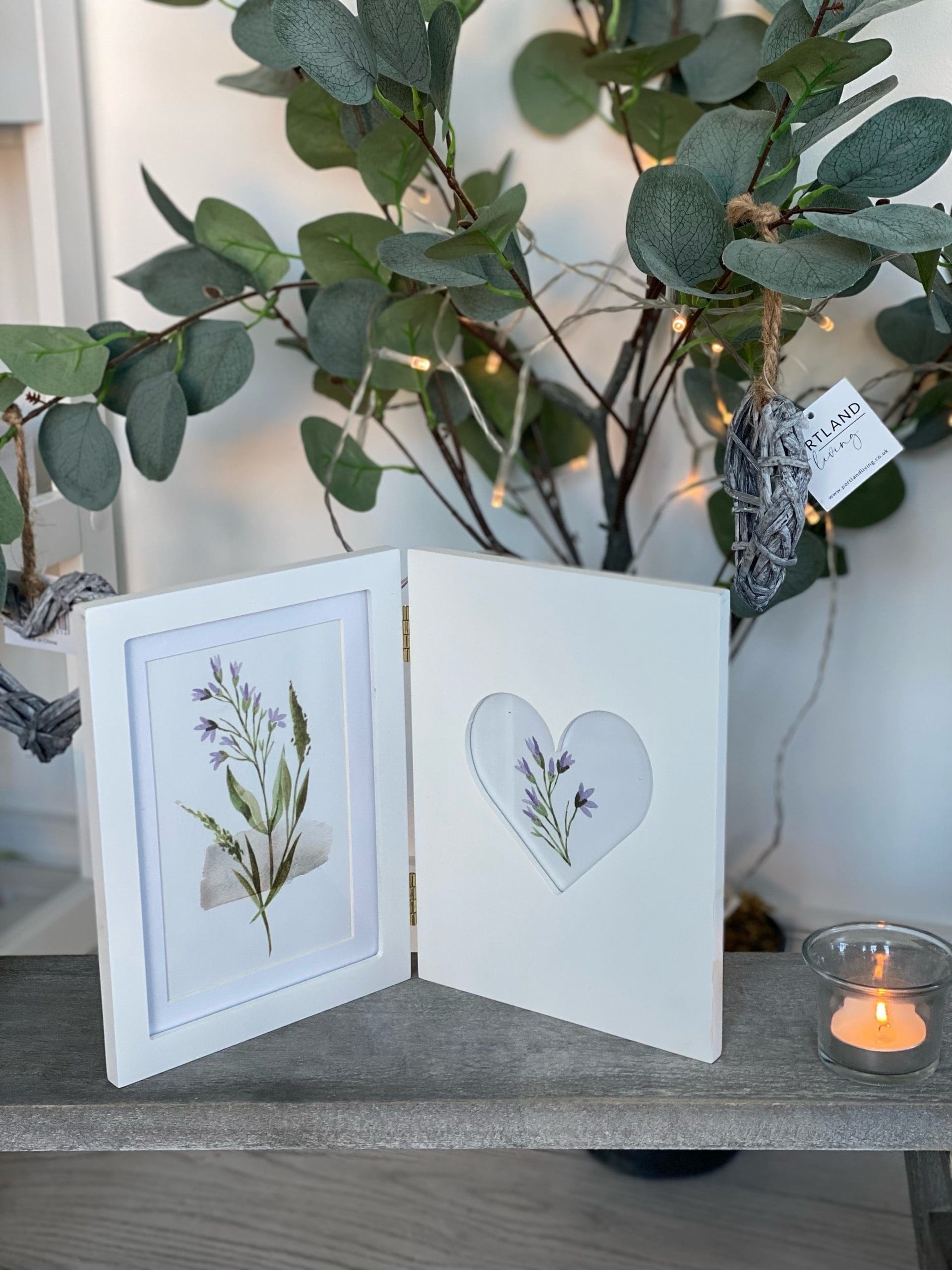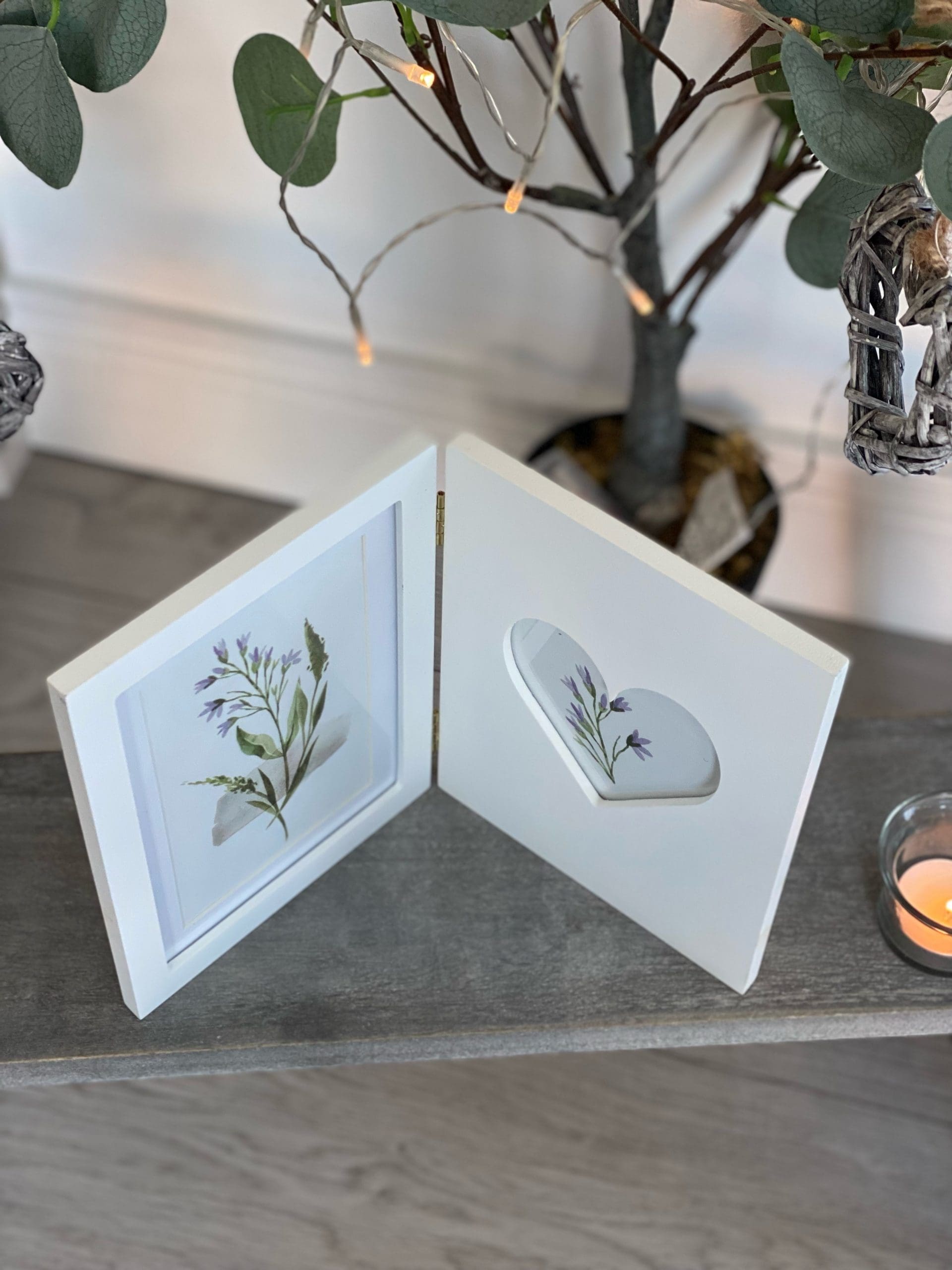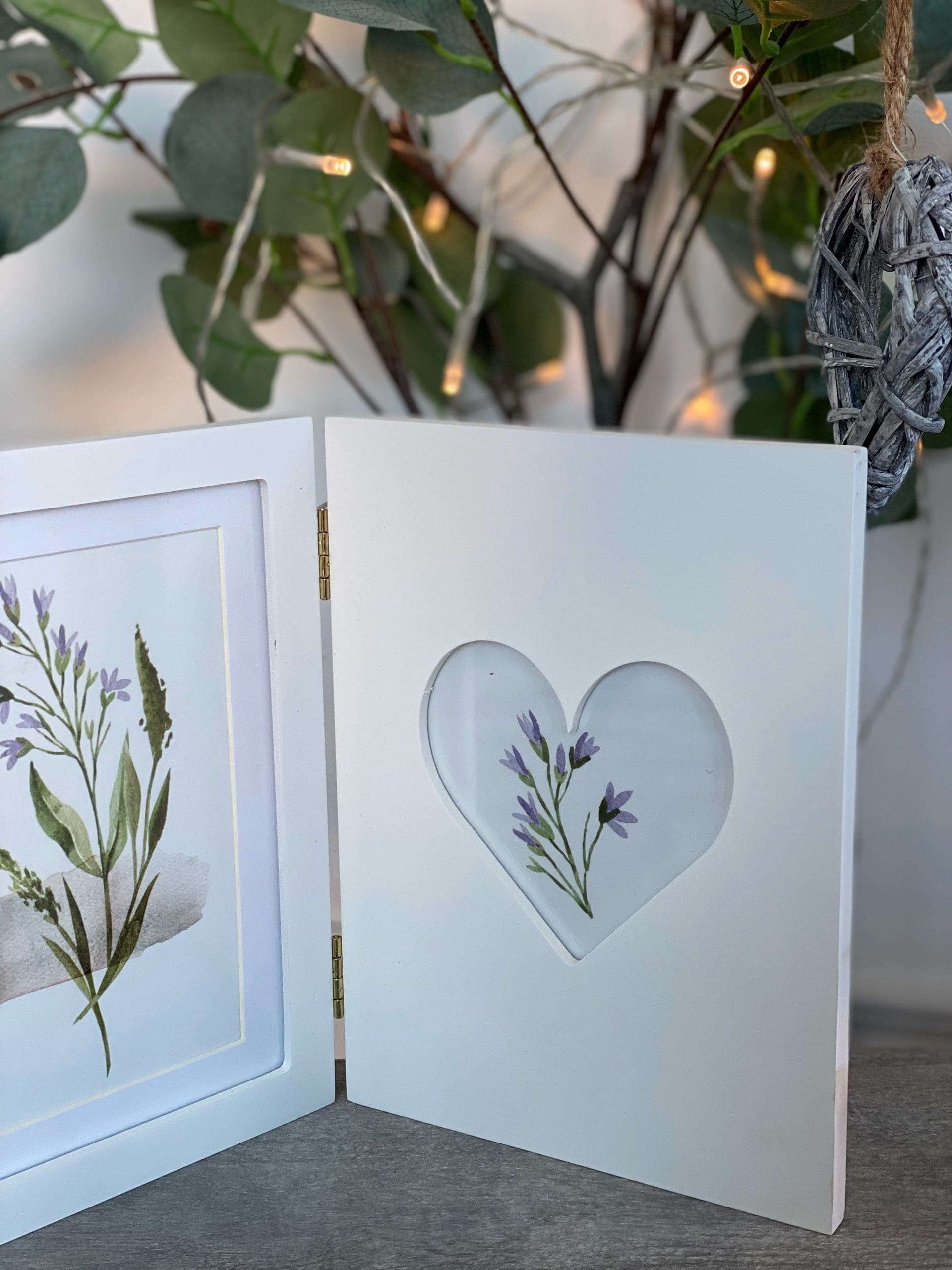 Folding Photo Frame Which can Stand Depending How It Is Folded Has Space For 2 Photos One Taking Up The Whole Side And The Second In a Heart Shape In The Middle.