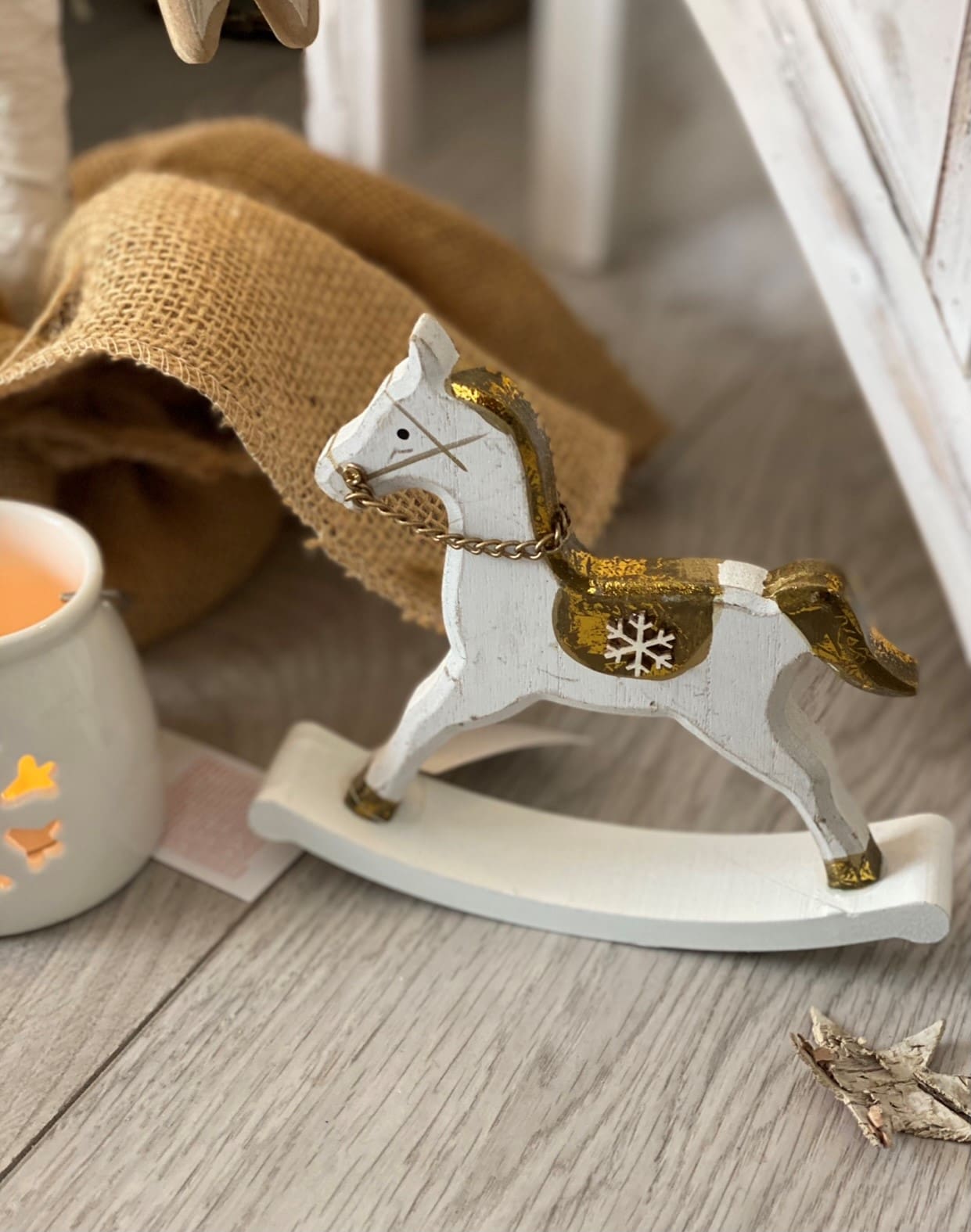 Sure to bring a Traditional touch to any festive themed home displays, a wooden rocking horse with gold trims and a vintage charm