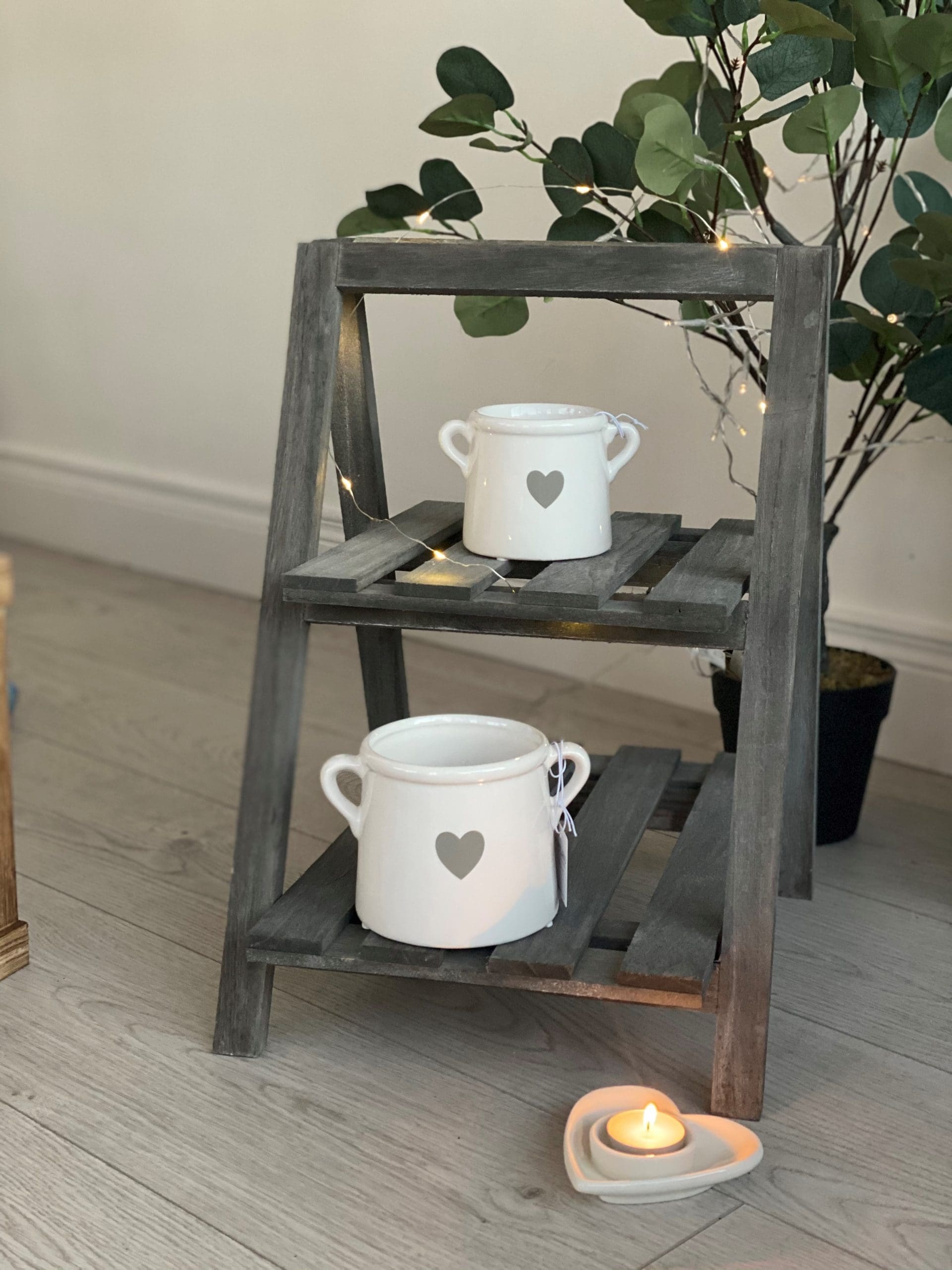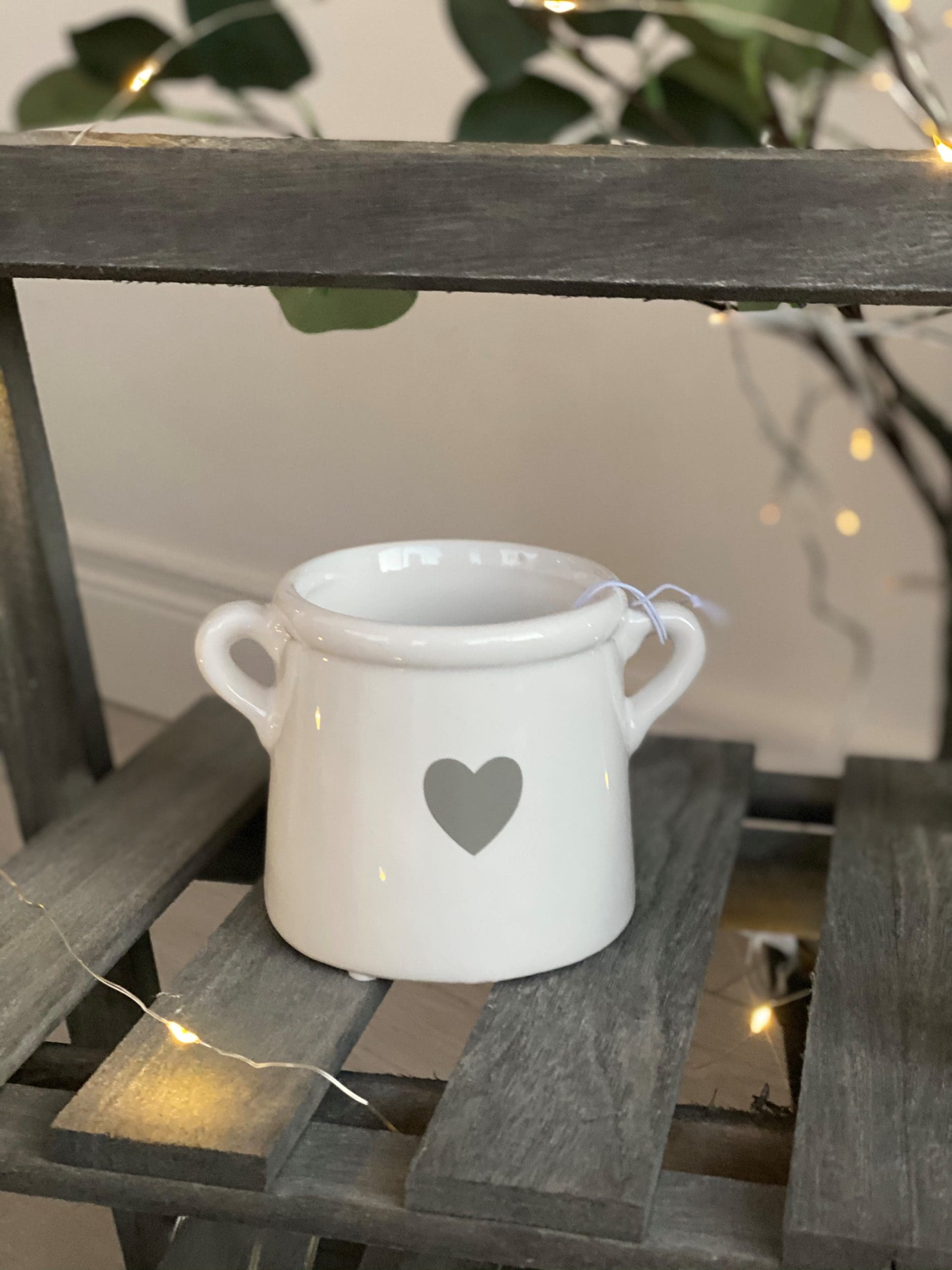 A beautifully simple white ceramic pot with a grey heart detail. Complete with twin handles. Available in two sizes.