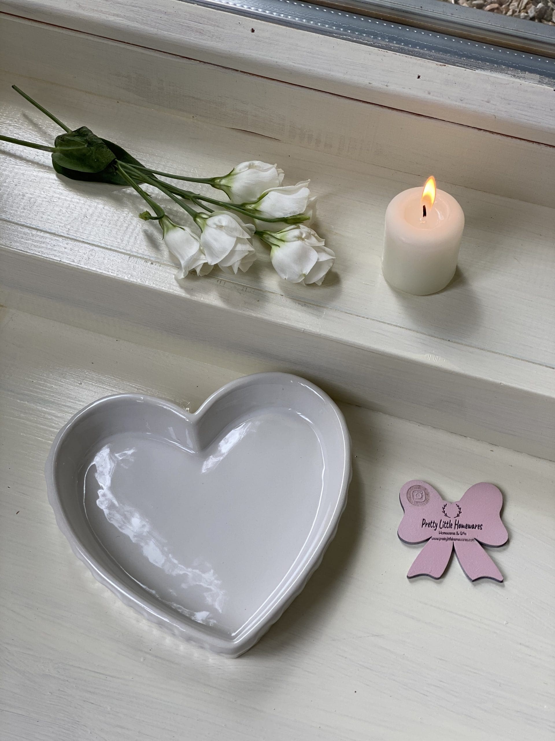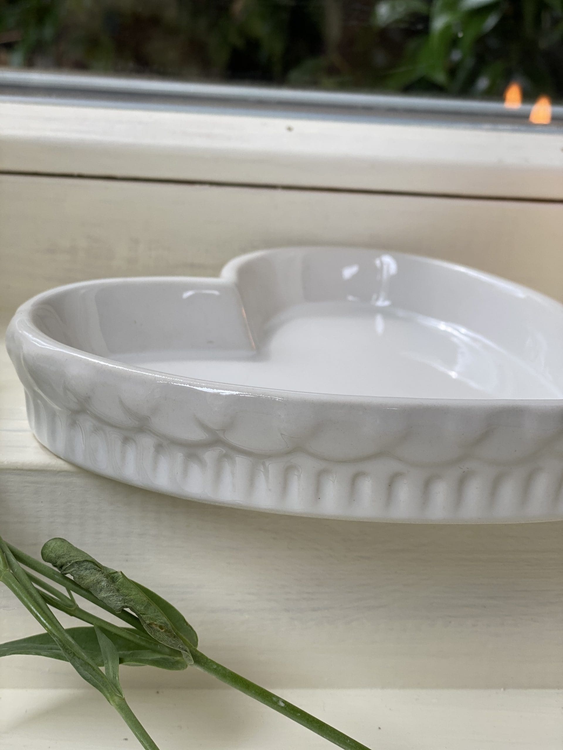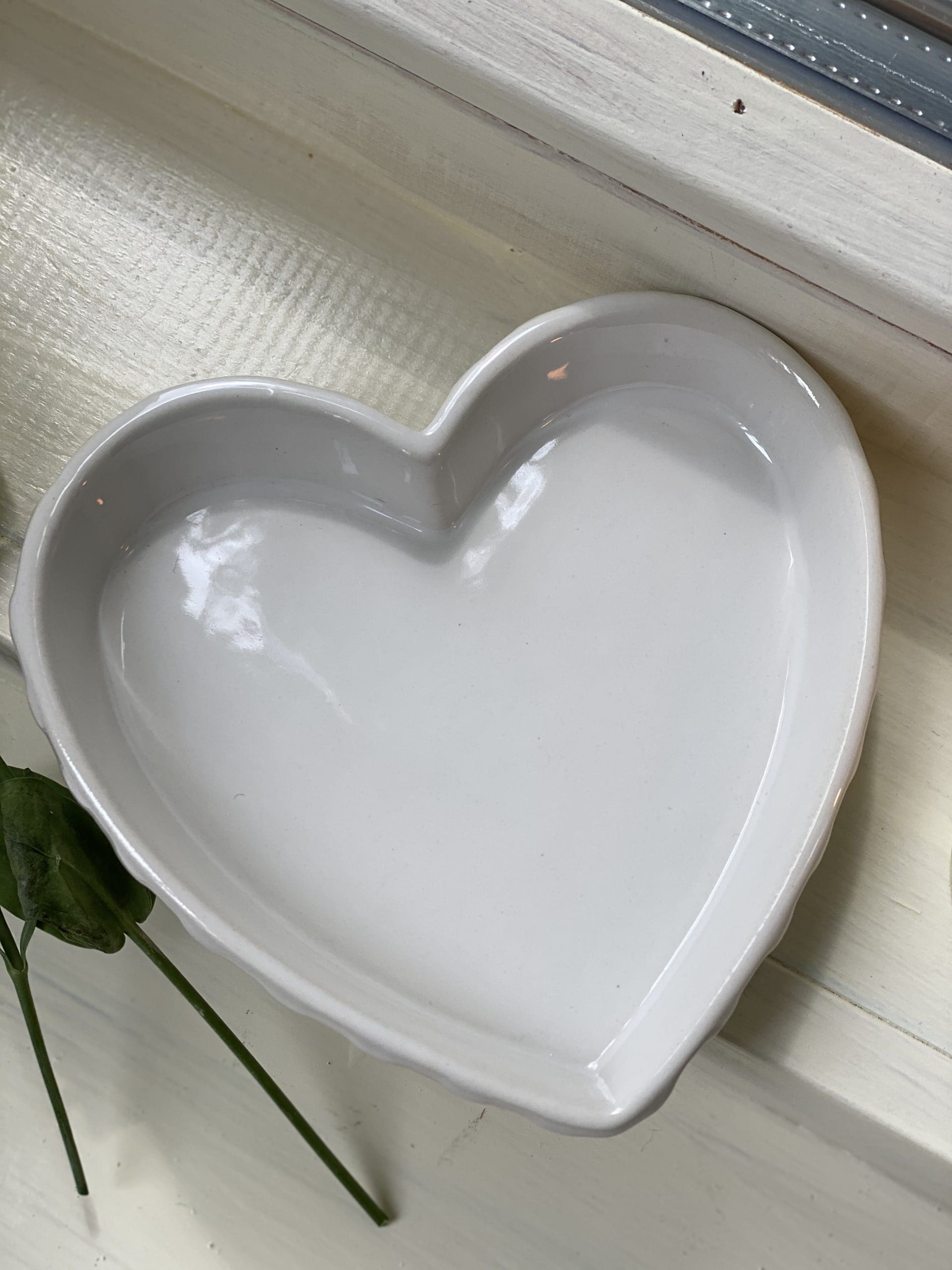 White ceramic heart-shaped dish with small heart detail on the rim. This ceramic dish measures 15cm x 14cm and is 2.5cm deep. Please Note that this product is safe for dishwasher or miccrowave use.