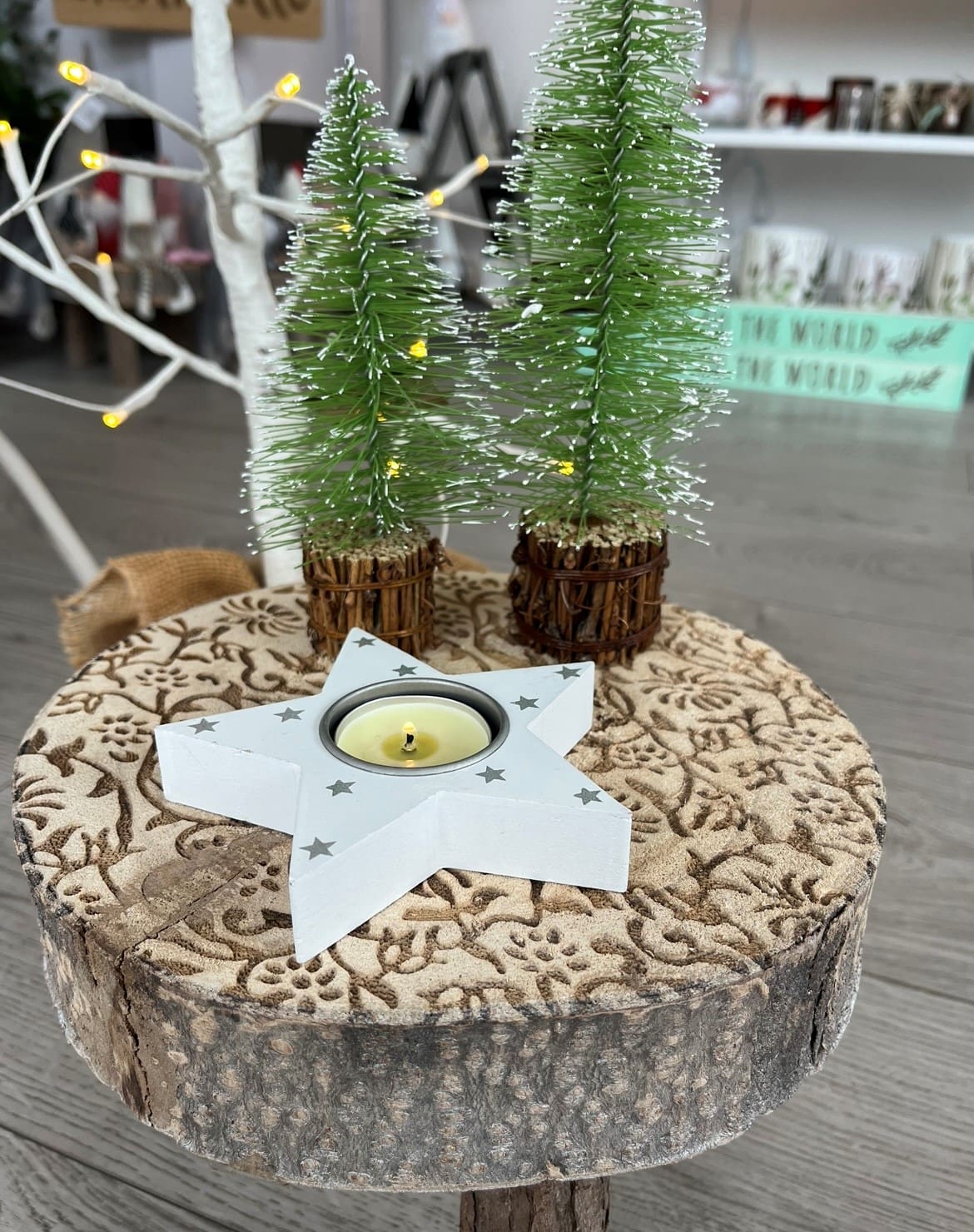 A chic and simple white t-light holder in a star shape, featuring mini grey star decal and a silver dip for a t-light. Perfect for creating a warm and cosy glow.