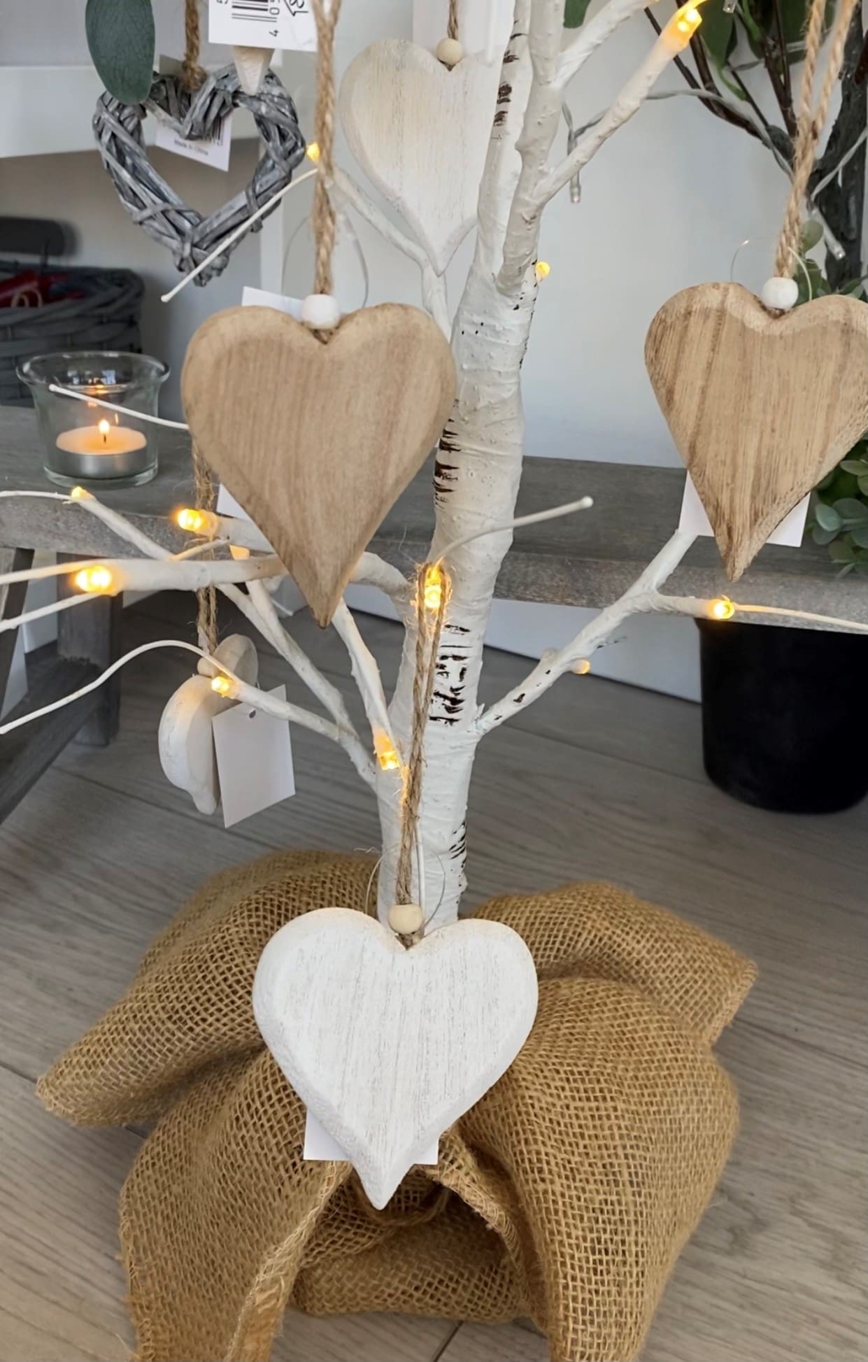 Wooden hanging heart, with an attractive whitewashed finish. Complete with beaded jute string hangers. Size 5.5 x 6.5cm + 7cm