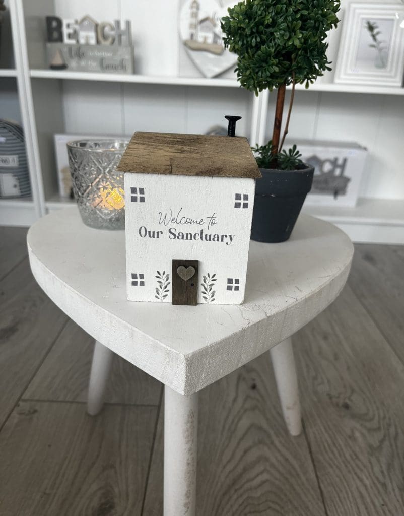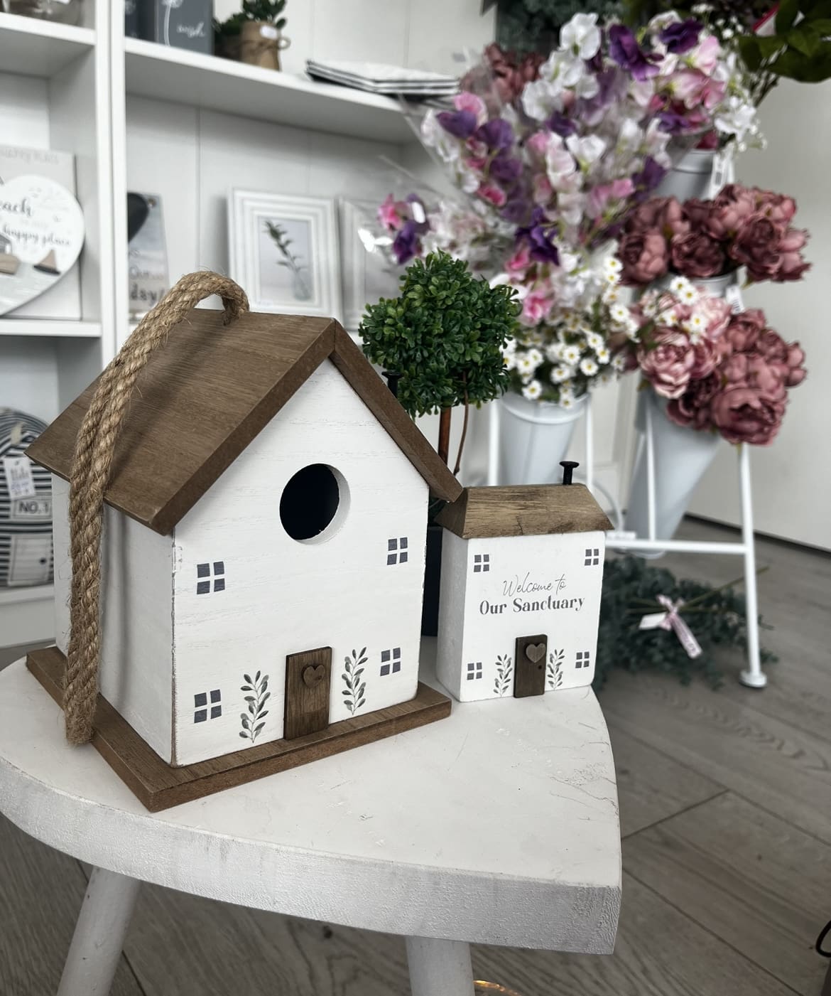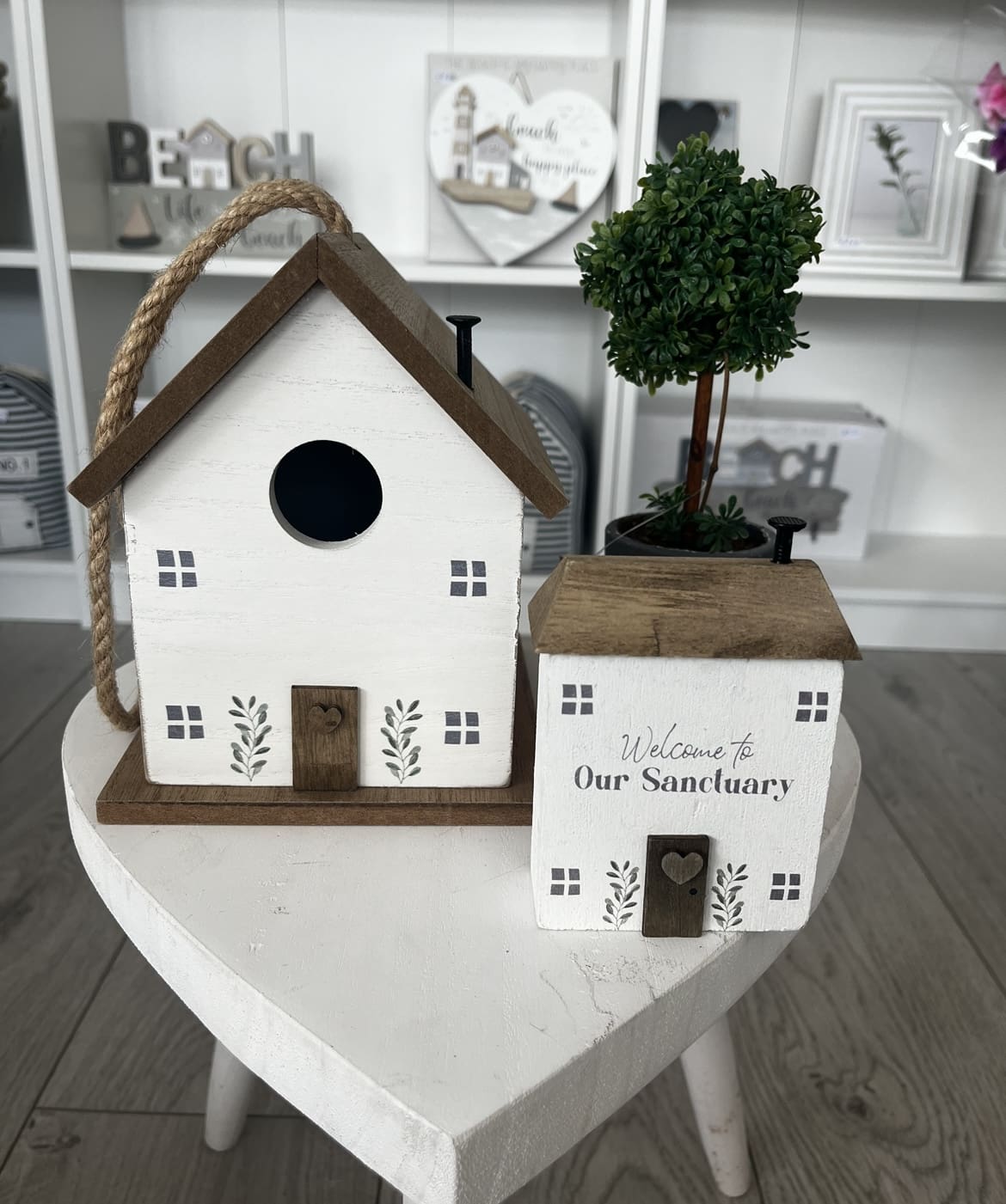 Beautiful Wooden Birdhouse, white with branches and natural roof Size: 14 x 15 x 17.5cm