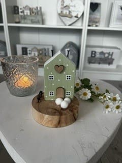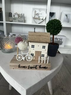 VideoWooden Standing home Sweet Home House Decoration with Bike A lovely little wooden house with cute pom pom and bike details Dimensions: 12x6x12cm