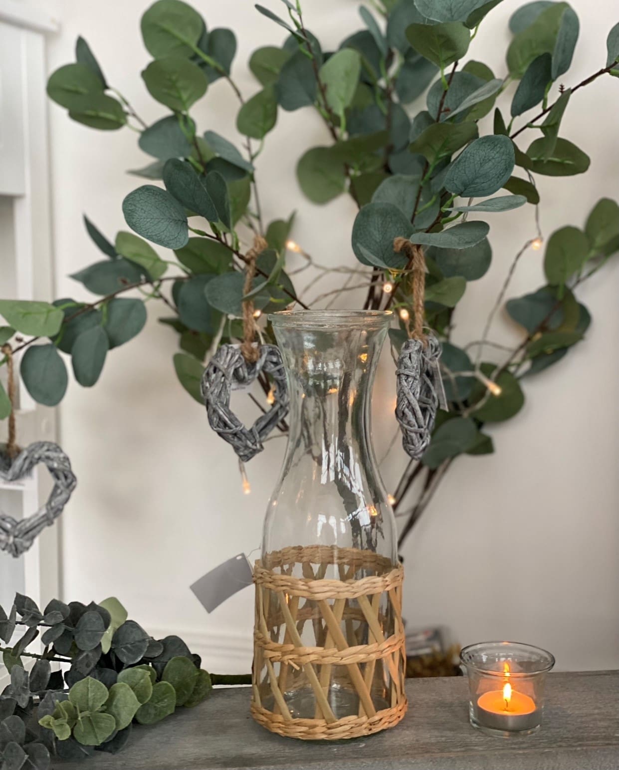 A tall glass carafe set within a simplistic inspired woven rattan casing